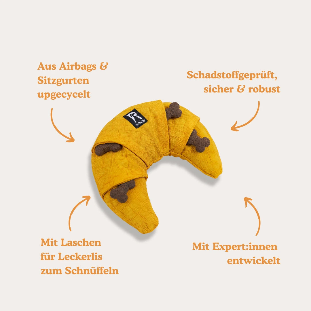 Das Croissant von Redoggo ist ein interaktives Spielzeug mit eingearbeiteten Taschen für Leckerlis - ideal für Nasenarbeit, mentale Auslastung und gemeinsames Belohnungsspiel.