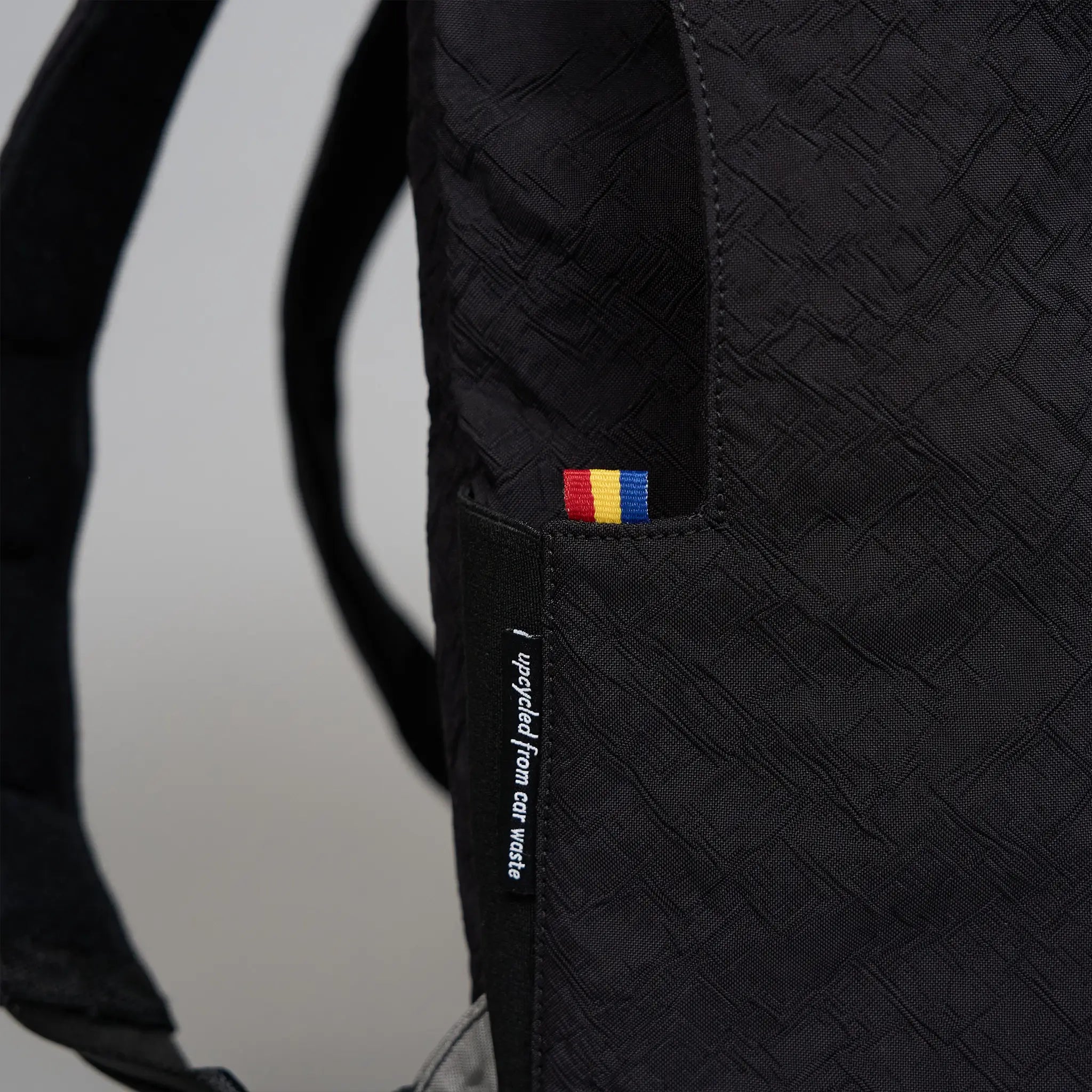 - Material: Hoher Anteil von über 85 % an Upcycling-Material: Airbag (PA 6.6 Nylonstoff), Sitzgurte, Gurtschloss. 15 % bilden konventionelle Materialien wie z. B. Fäden, Reißverschlüsse, Bänder, Polsterungen, Futtereinlagen und Versteller für die Träger.